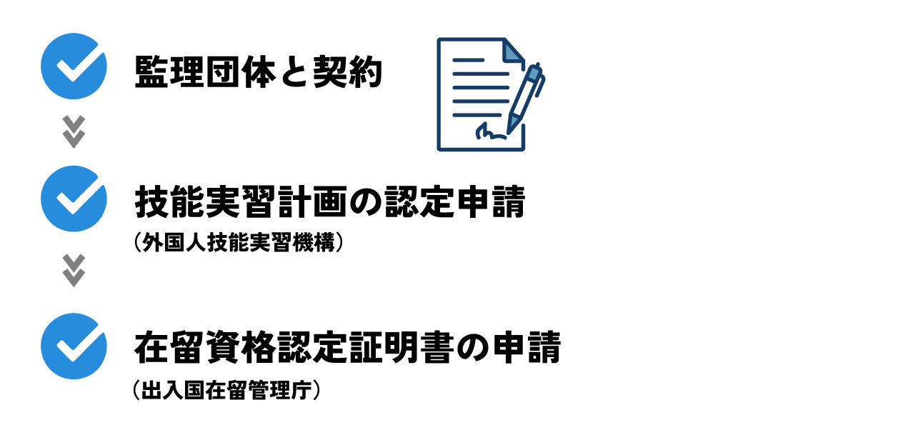 受け入れには、事前の書類準備と申請が必要です。計画的に進めるためにも、監理団体と連携しながら進行します。主な流れは次の3つです。